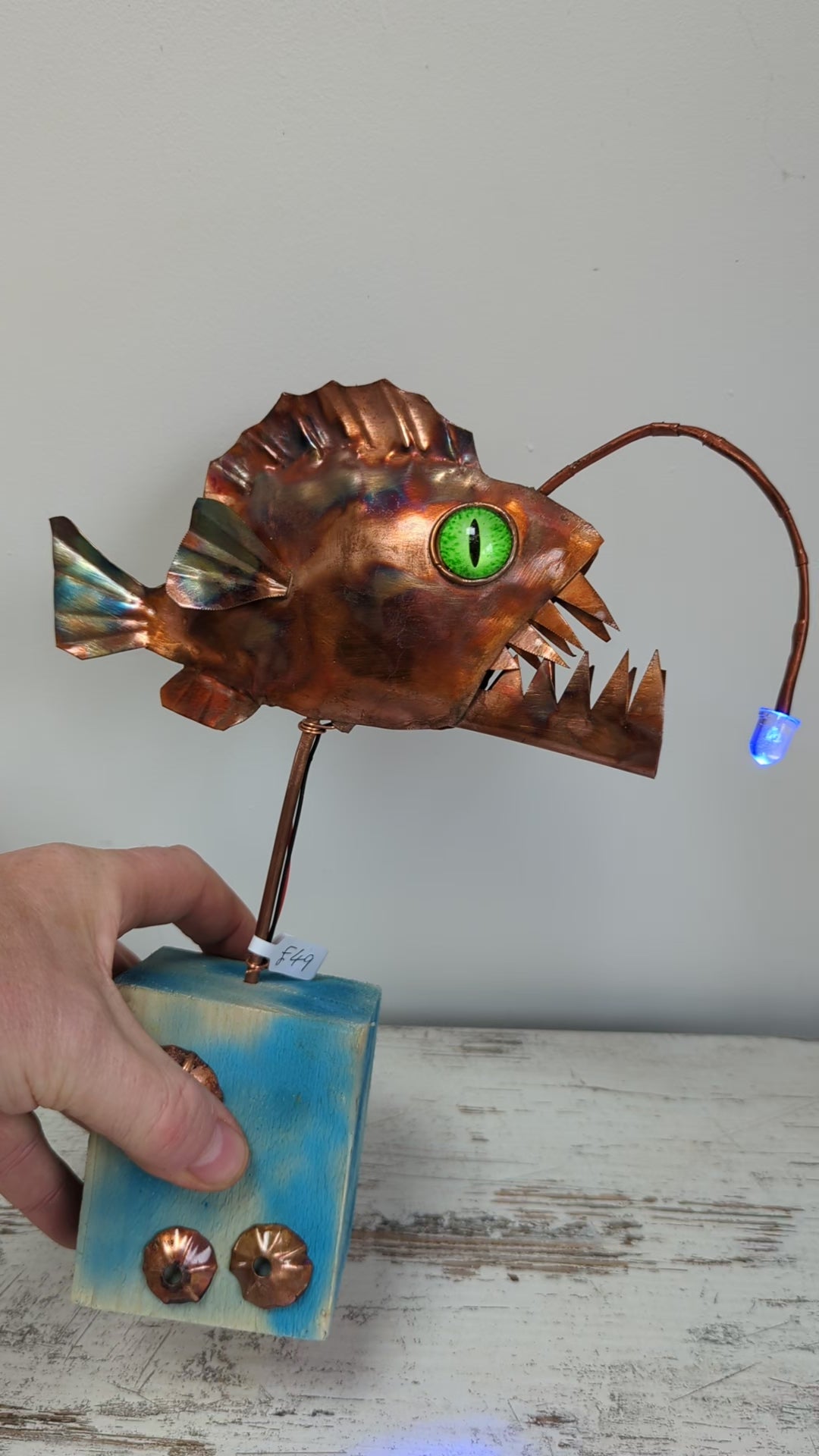 Bring a splash of ocean whimsy to your space with this playful copper anglerfish sculpture. Perched on a sturdy wooden base, its battery-operated lure casts a charming glow, capturing the mysterious allure of the deep sea. Perfect for adding character and a touch of underwater magic to any room.