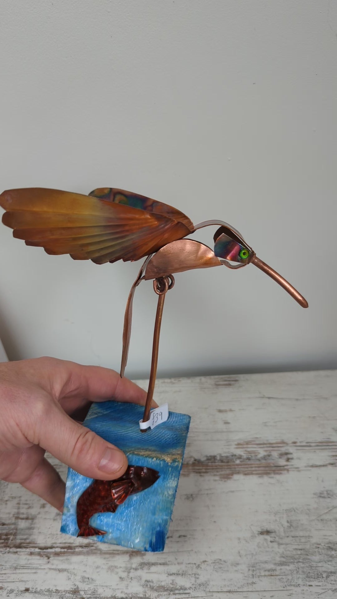 Bring a splash of charm to your space with this playful copper kingfisher perched on a rustic wooden block. Featuring a gleaming copper fish on the base, this delightful décor piece adds a touch of whimsy and nature-inspired elegance to any room. Its unique craftsmanship and warm metallic shine make it a perfect conversation starter for your home or office.