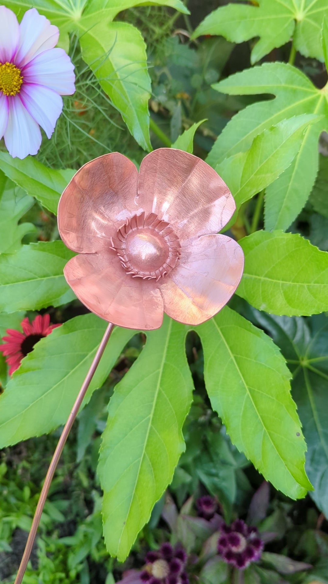 A handmade copper poppy on a copper stem. The flower has been coated with lacquer to preserve the shine but please be aware it may still darken and tarnish underneath over time. Please note that the vase is NOT included and that the photographs are for illustration purposes only but you will receive an item made to the same high standard.