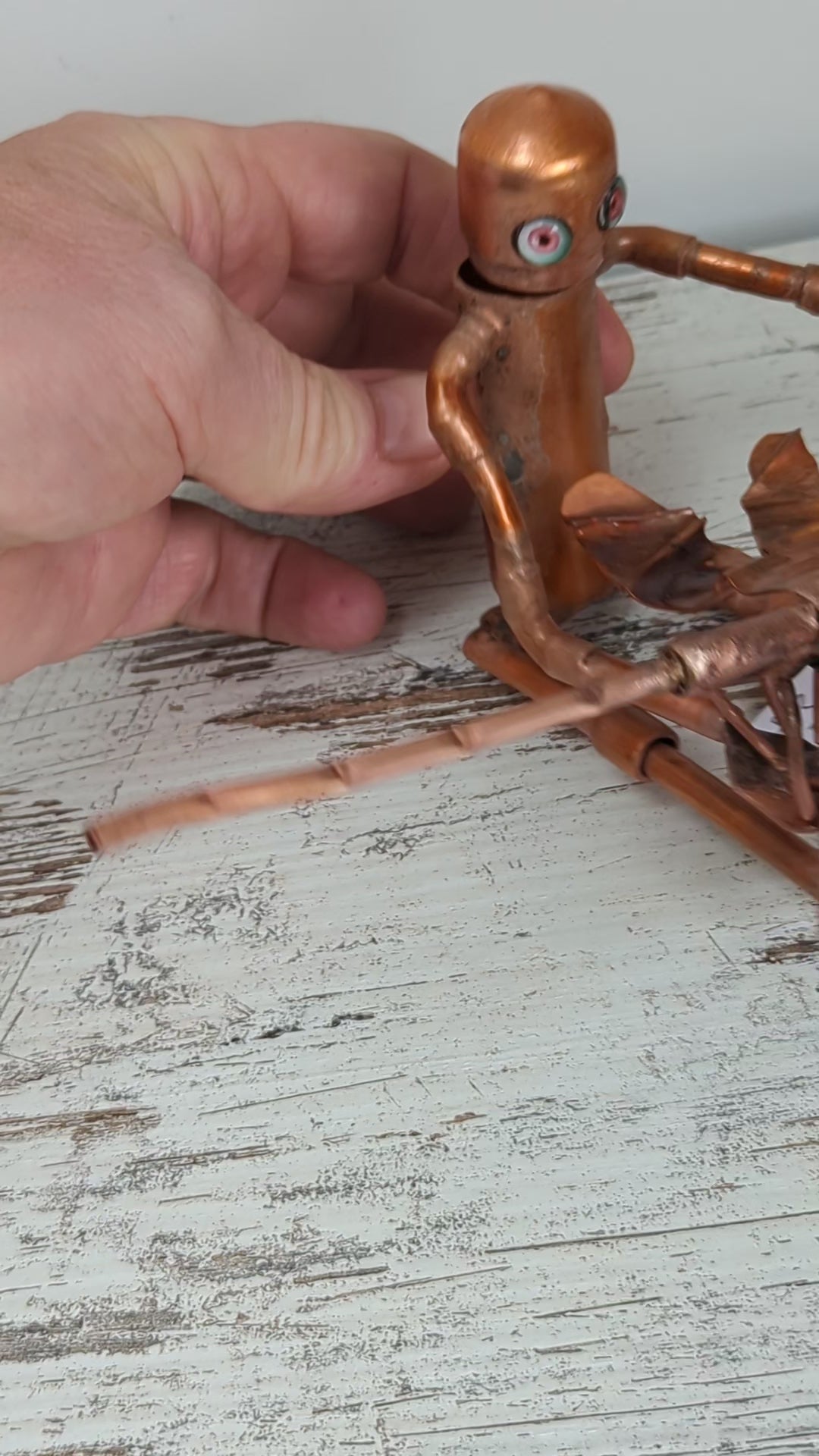 This charming little robot, crafted entirely from gleaming copper pipes, holds a delicate copper dragonfly in its hands. Its quirky design adds a playful touch to any space, blending industrial style with whimsical charm. Perfect as a unique gift or a standout décor piece that sparks curiosity and smiles.