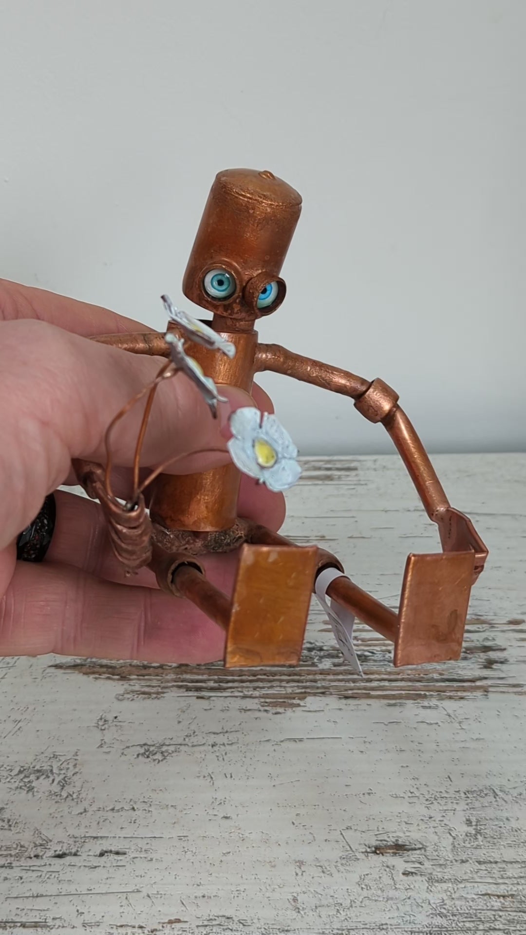 Meet your new quirky companion—a charming copper robot crafted from intricate pipework, proudly holding a bouquet of delicate copper daisies. This playful piece blends industrial artistry with floral whimsy, adding a spark of creativity and cheer to any space. Perfect for those who appreciate a touch of fun and unique craftsmanship in their decor.