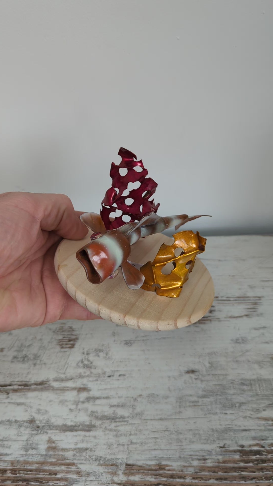Bring a splash of charm to any space with this whimsical copper fish, beautifully perched on a circular wooden base. Painted copper coral adds a delightful touch of underwater magic, making it a playful accent that brightens your home décor with artistic flair.